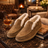 Modello polacchina senza lacci realizzata in pelle di vitello scamosciata di colore tabacco.