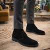 Polacchino in camoscio nero dal design essenziale ed elegante, caratterizzato da linee pulite e finiture curate. La suola robusta garantisce comfort e stabilità, rendendolo ideale per un utilizzo quotidiano raffinato. Un modello versatile, perfetto per completare outfit casual chic e contesti urbani con stile.