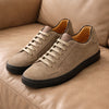 Sneaker model made of taupe suede calfskin with dark brown leather insert on the tongue.