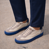 Modello sneakers realizzato in tessuto beige con inserti in pelle scamosciata di colore taupe e riporto tallone in pelle vernice blu.