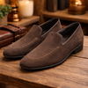 Modello mocassino realizzato in pelle scamosciata di vitello di colore testa di moro.