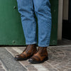 Modello stivaletto realizzato in pelle di vitello di colore legno con sfumature effettuate a mano su tomaia.