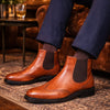 Eleganti chelsea boots in pregiata pelle di vitello color cuoio, caratterizzate dalla raffinata coda di rondine sulla punta. La suola in gomma extra light garantisce leggerezza e comfort, mentre la fodera e il sottopiede in pelle assicurano qualità costruttiva superiore. Ogni paio è frutto di meticolosa lavorazione artigianale, interamente realizzato in Italia con dedizione ai dettagli.