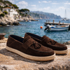 Eleganza rilassata e carattere artigianale si incontrano in questa espadrillas in suede testa di moro.