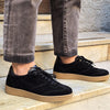 Sneakers realizzate in pregiata pelle scamosciata idrorepellente, arricchite da dettagli in pelle liscia nera. Suola in gomma extra leggera color ambra, con fodera interna in pelle nera. Plantare estraibile in memory foam rivestito in pelle per un comfort superiore. Elegante e versatile, questa calzatura artigianale è completamente Made in Italy, perfetta per completare con stile qualsiasi look.
