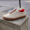 sneakers in morbida pelle scamosciata grigio nuvola, caratterizzate da un interno in tessuto traspirante rosso Ferrari che aggiunge un tocco di dinamismo. La suola in gomma color ambra completa il design raffinato, garantendo comfort e stile in ogni passo.