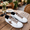 Sneakers in pelle bianca martellata con dettagli STELLA cucita a mano tono su tono e accenti color tortora. Linee pulite, comfort quotidiano e stile contemporaneo, ideali per un look casual-chic raffinato.